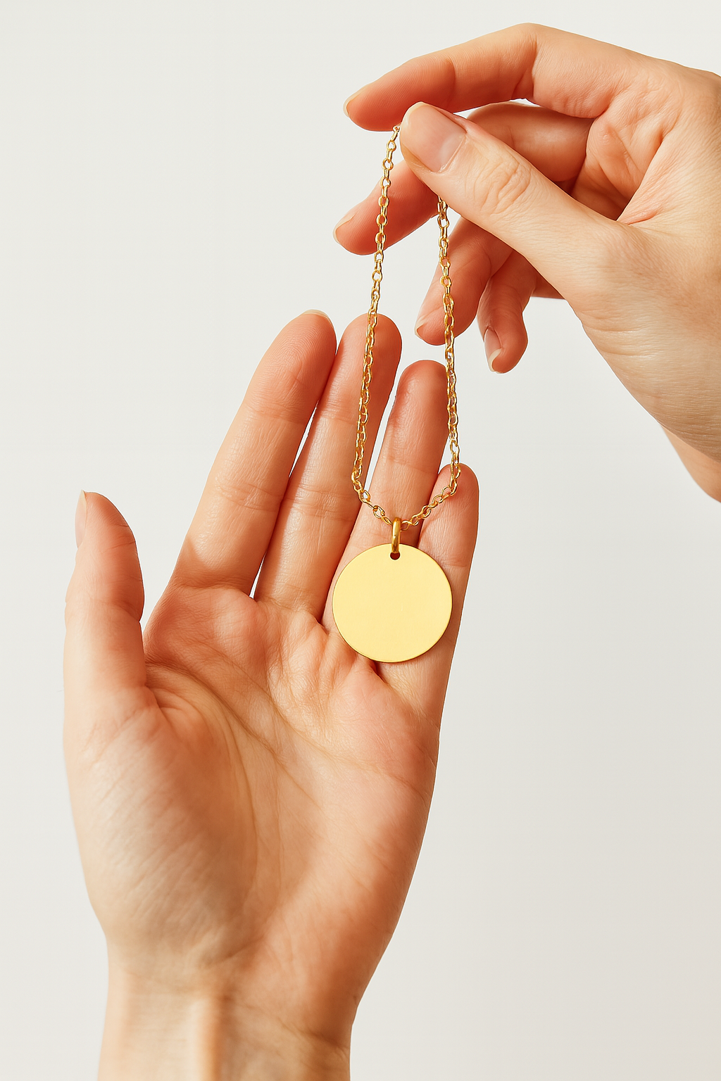 Este elegante collar con dije en forma de disco personalizable está confeccionado en acero inoxidable con baño de Oro de 18k, pulido para garantizar un brillo excepcional y una resistencia prolongada. Su diseño refinado permite incorporar un detalle personal exclusivo, haciendo de esta pieza un accesorio distinguido que realza con sofisticación cualquier atuendo.